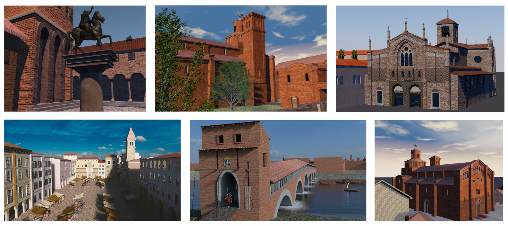 The 3D models have been realized for three main goals: (1) creation of a virtual interactive environment of the city of Pavia in the 16th century, to show buildings, churches and monuments with high accuracy; (2) reproduction of different views of the city and production of videos shot with a camera that tour around the city without constraints; (3) development of an app for smartphone and tablet to get the information about the area displayed, with the possibility of comparing in situ the existing buildings with those rebuilt in 3D.