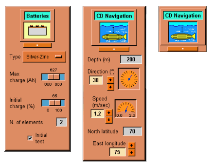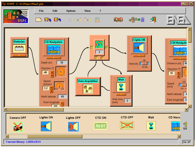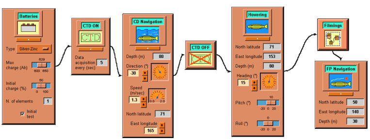It is to be noted that, because of the generality of VISPS, the particular blocks presented in this example do not necessarily correspond to real functions of SARA, which, at the moment, cannot yet be precisely defined. Instead, they should be considered as examples of possible blocks to be used to build possible plans. Here we will assume that: the hypothetical block Batteries selects what kind of batteries to activate on the robot (supposing that there are more than one) and sets up their parameters; block CTD ON activates the CTD sensor to get data about physical properties of water; block CD Navigation sets up parameters for a constant-depth navigation and makes the robot reach a certain position; block CTD OFF deactivates the CTD sensor (which remains on for all the distance covered by the robot during its movements); block Hovering allows parameters to be set for a particular position to be reached and for a particular orientation according to which the robot must arrange itself; macro block Filmings allows a scene to be shot through a video camera at fixed intervals; block FP Navigation, lastly, sets up the coordinates of a final point the robot has to reach.