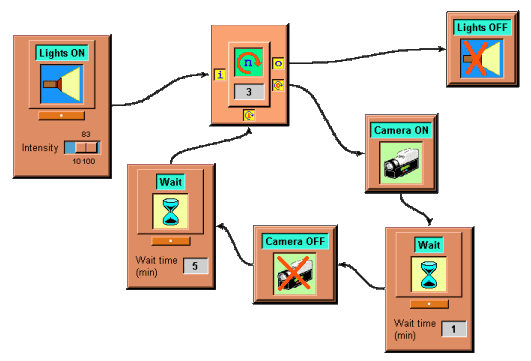 of Figure 3We will assume that: block Lights ON switches the lights on, according to a certain intensity; for three times, as many as specified in the FOR block's entry, the following sequence of operations is executed: the camera is turned on (block Camera ON), the robot waits one minute (block Wait), the camera is turned off (block Camera OFF) and the robot waits five minutes (block Wait); at last, once the iteration is over, block Lights OFF switches the lights off.