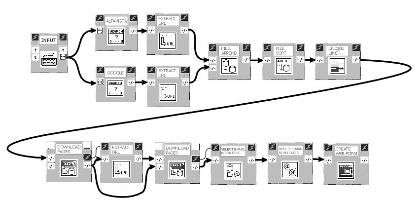 The first module in the figure (block INPUT) allows the user to enter the words/sentences to be searched for. These words/sentences are then provided, in parallel, as inputs, to blocks ALTAVISTA and GOOGLE, which connect to their relative search engines and produce HTML pages (local temporary files) containing the search results. Blocks EXTRACT URL analyze these results, locate the links they contain and create text files with one link per line. The purpose of block FILE APPEND is to link together the files it receives as inputs and to produce a single file. In the example, therefore, it generates a file holding all the links present in both the Altavista and the Google search results. This file is then alphabetically sorted by block FILE SORT and "cleaned up" by block UNIQUE LINE, which eliminates any duplicated lines (links).