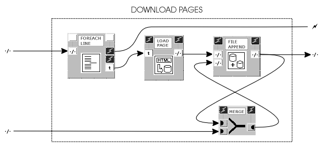 As one can see from the figure, a file path name is provided as input to block FOREACH LINE. This block, in turn, is a macro block implementing the foreach control construct, allowing elements of a sequential data structure (in this case, a file) to be analyzed and made available, one after another. Block FOREACH LINE emits the various lines (links) of its input file, as they are taken out, but only at the end of this process does it activate its output control signal. Block LOAD PAGE connects to the URL it receives as input and downloads the corresponding HTML page on a temporary file, whose path name is made available as its output. The MERGE block fires when either of its two input ports receives a new data item, which is then emitted as an output. Here, it allows an initial buffer path name to be specified, to which, during the subsequent iterations, the various HTML page contents will be added by block FILE APPEND.